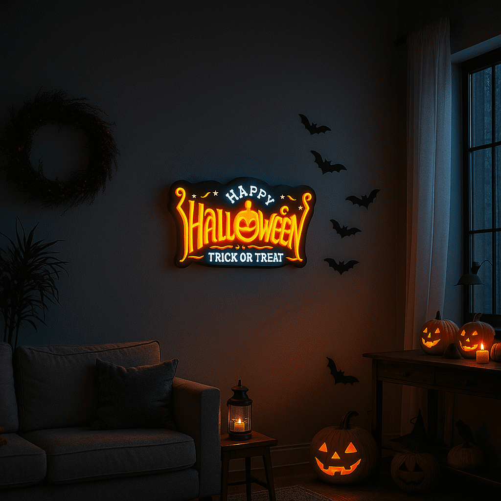 Spooky Words & Phrases: Sometimes words can be as spooky as images! Our text-based neon signs include phrases like “Happy Halloween”, “Trick or Treat”, “BOO!”, “Let’s Get Spooky”, or edgy slogans for adult Halloween parties. These Halloween neon light signs feature stylish fonts with a creepy twist – imagine a dripping blood script or a ghostly cursive. A “Happy Halloween” neon sign in vibrant colors will bring traditional Halloween joy to your party décor and set the spooky mood just right. Hang illuminated words on your wall or above a candy table to get guests into the festive spirit. You can choose from our preset phrases or request a custom phrase of your own. The bright neon text adds a modern yet nostalgic Halloween touch, perfect for photo booth backdrops, office lobbies, or living room decoration during October.